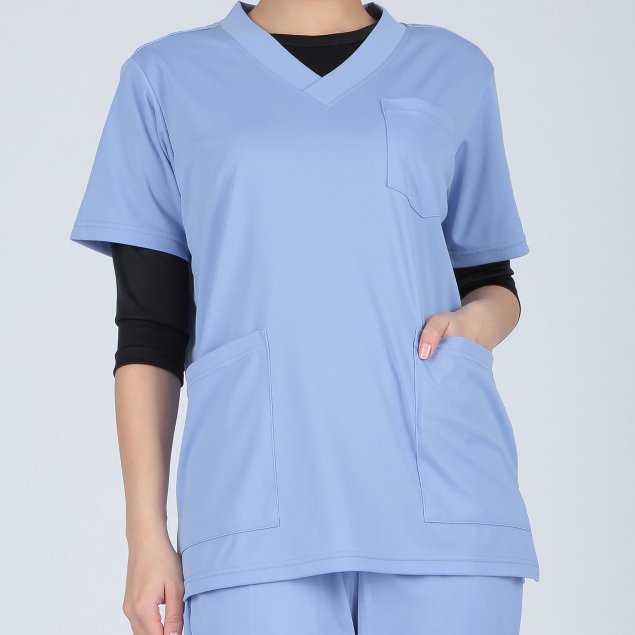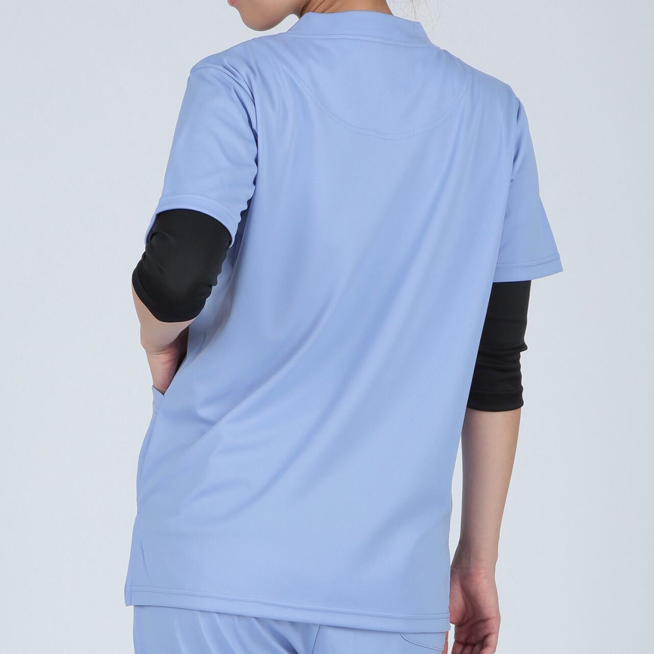 スッキリシルエットで伸縮性があり、シワにならないシンプルニットスクラブ。